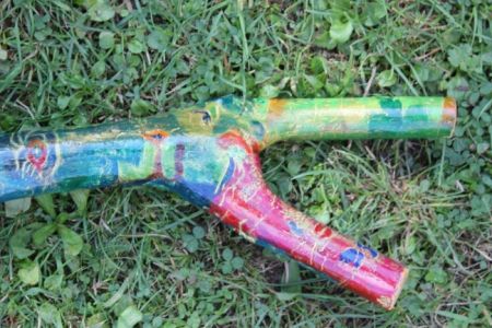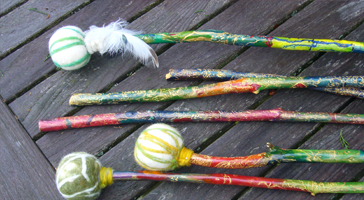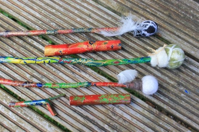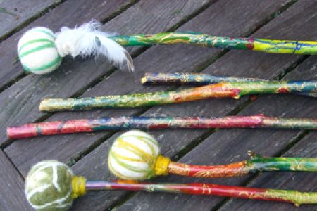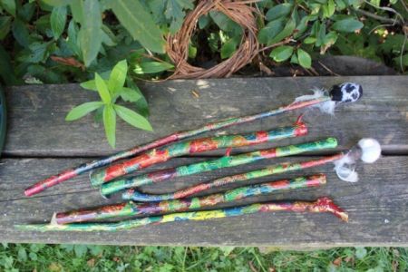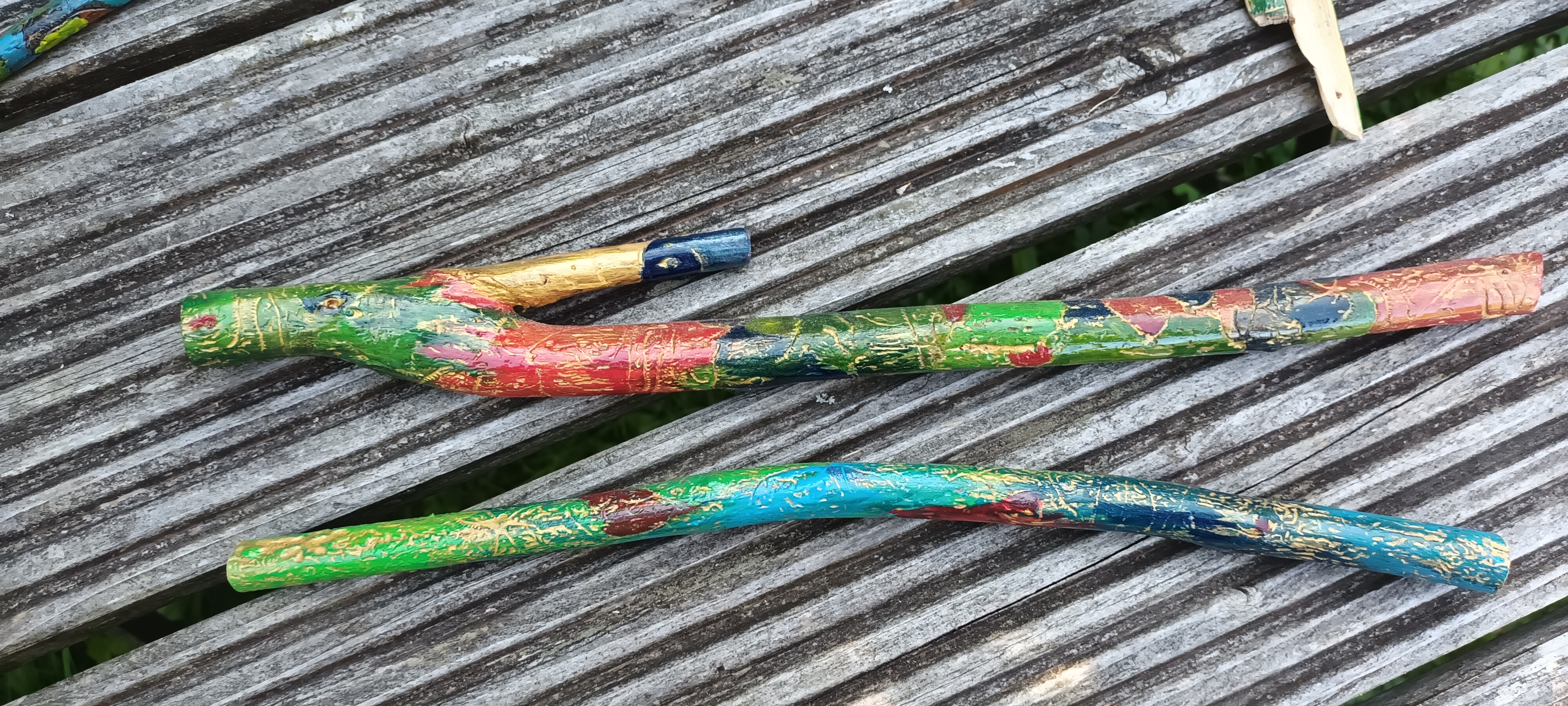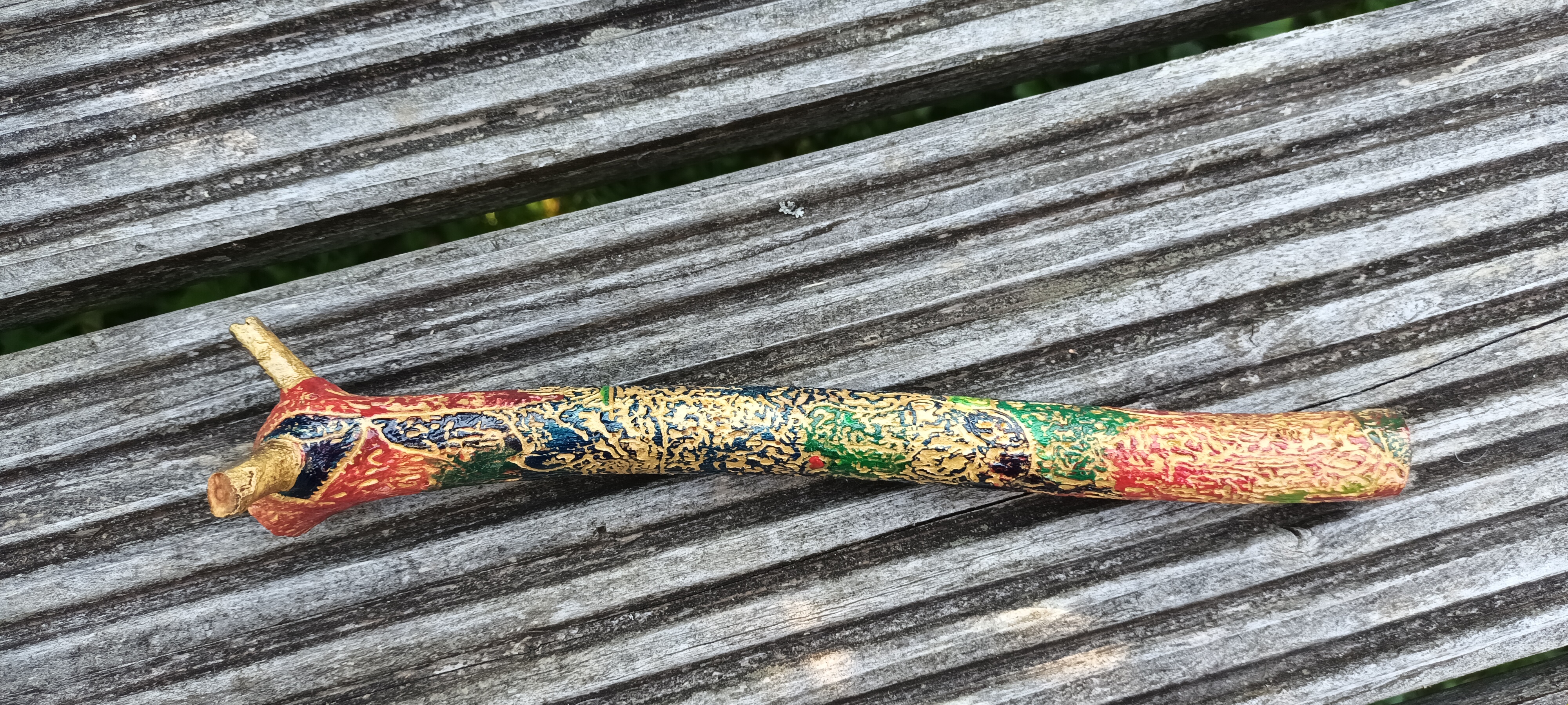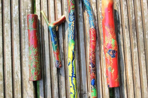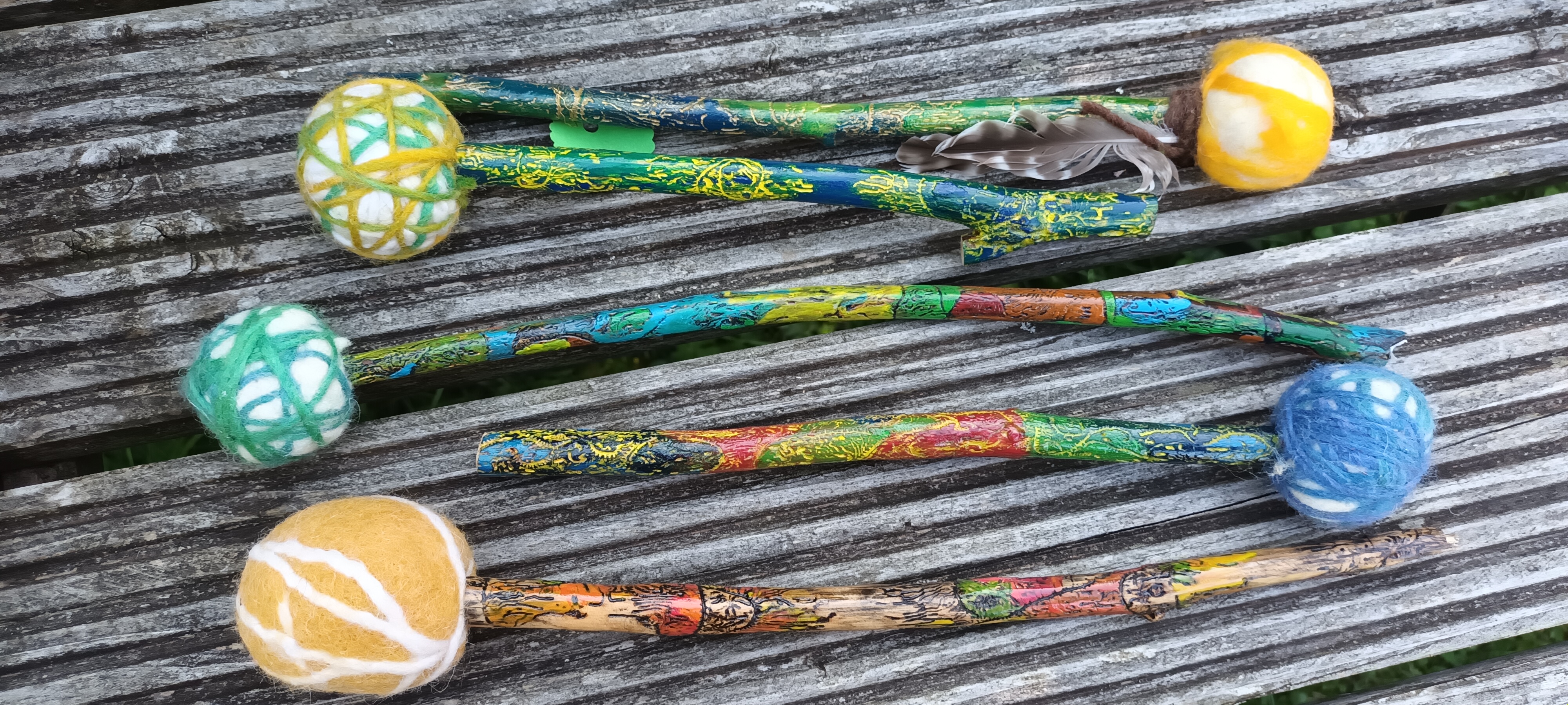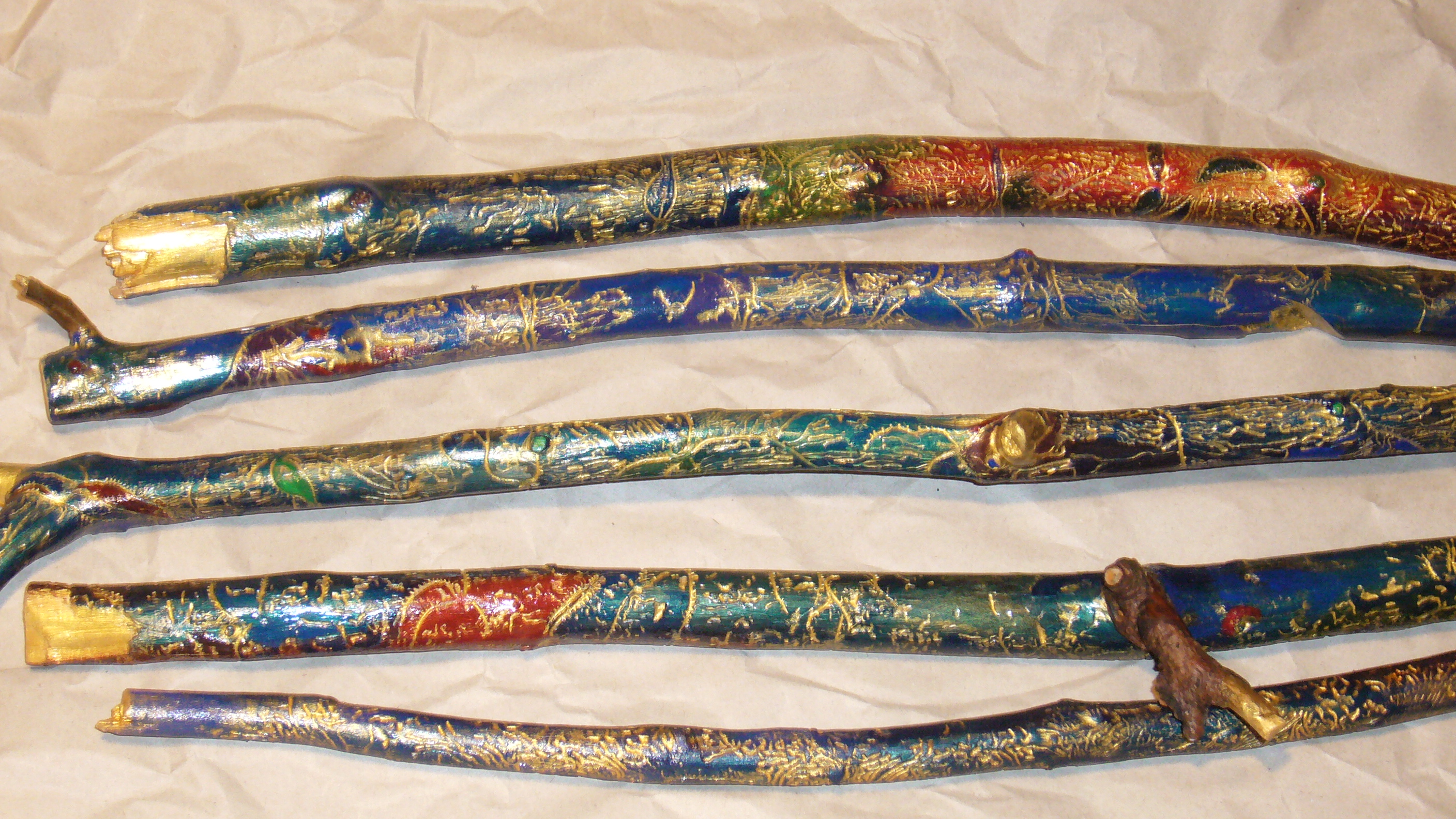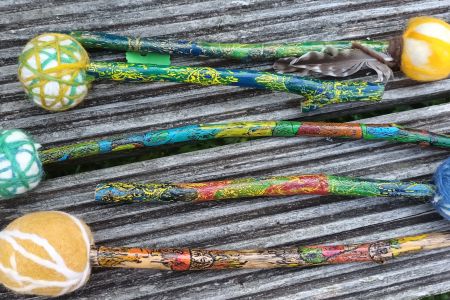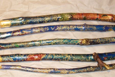 Aus diesem Gesamtpaket sind nun Kunstobjekte, Zauber-, Trommel - Rede- und Pilgerstäbe entstanden.